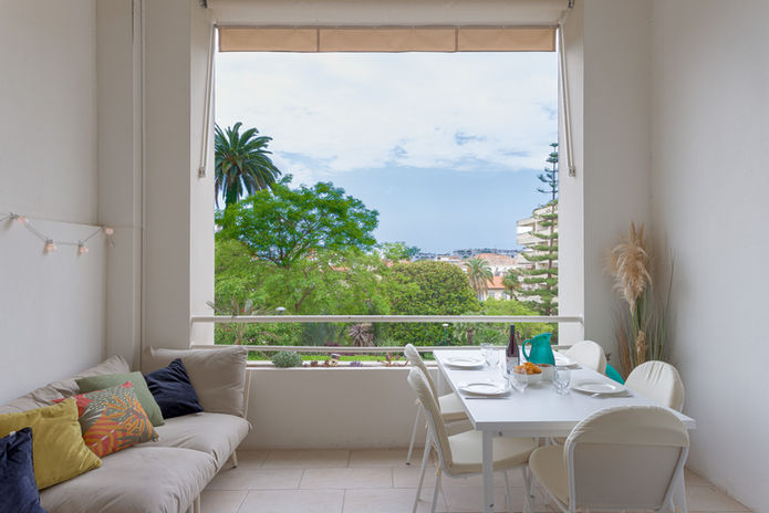 Furnished with a large comfortable sofa and a dining table that can accommodate several guests, it invites both relaxation and shared moments, in a calm and green setting, rare in Cannes.